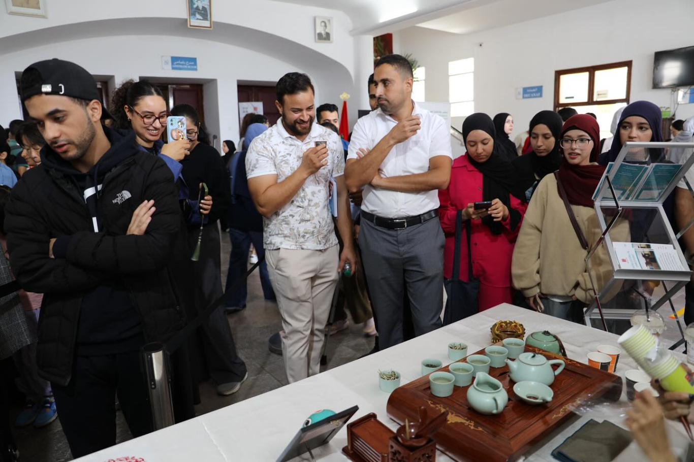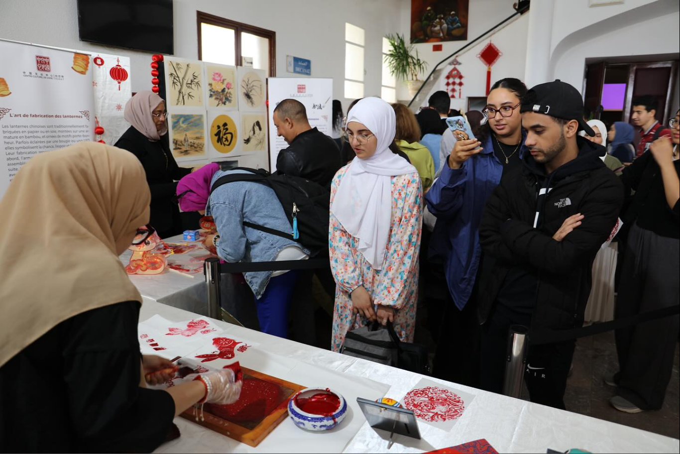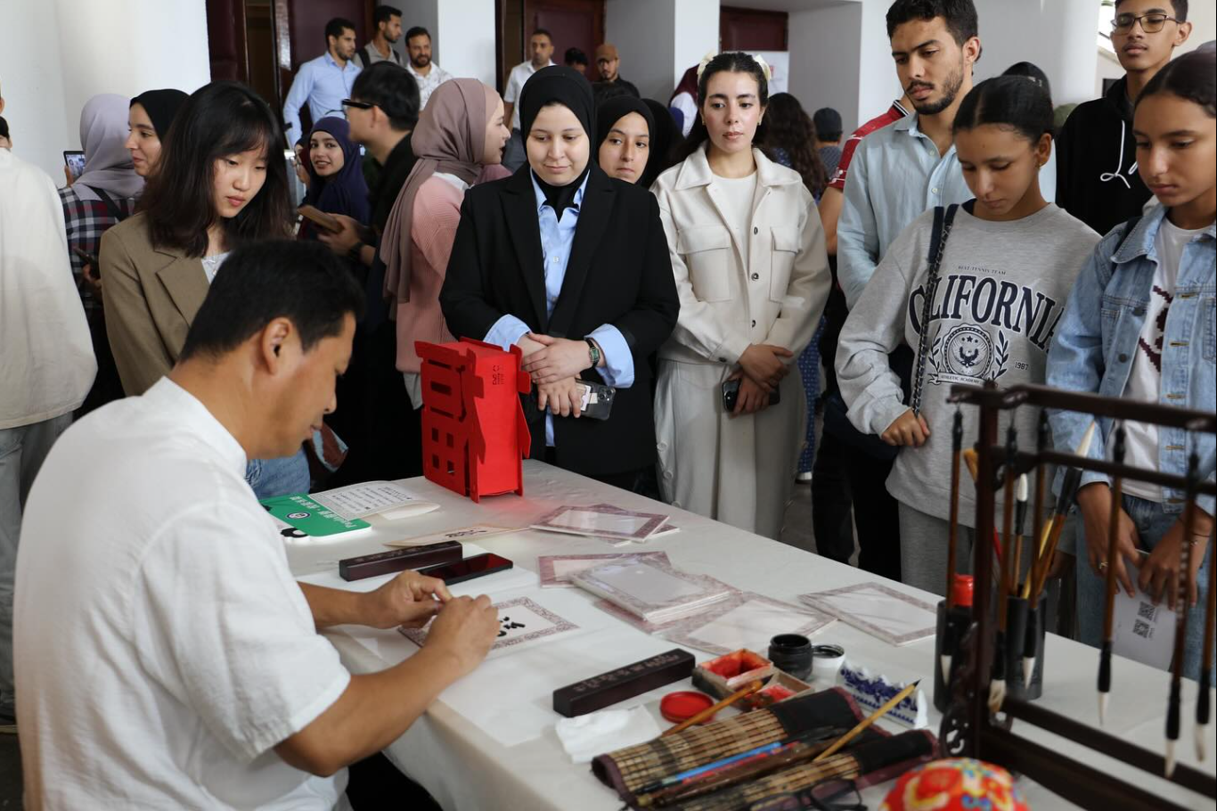 在穆罕默德五世大学的活动现场,中国文化互动体验区人头攒动,每个展位都是一扇通往中国的文化之窗: